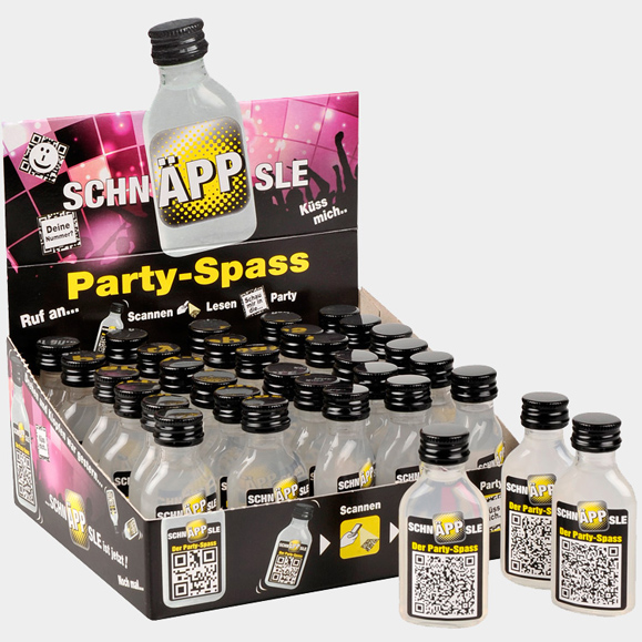 Witzige Trink- und freche Flirt-Sprüche „versteckt" im Code-Muster des Etiketts der kleinen Fläschchen.